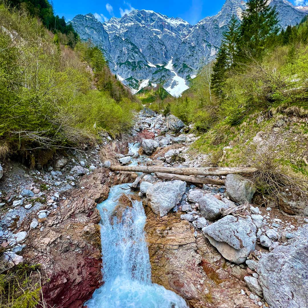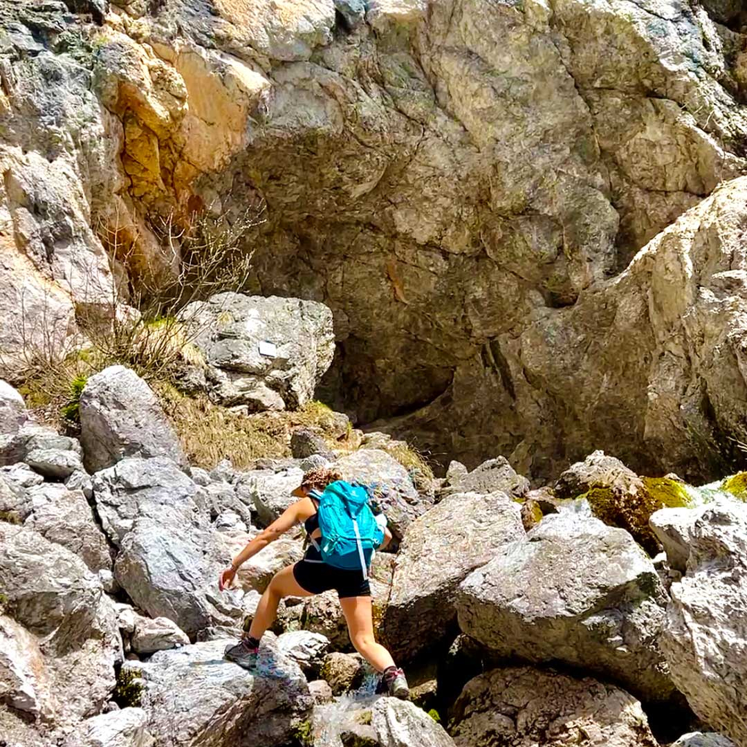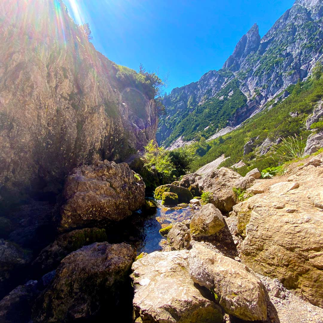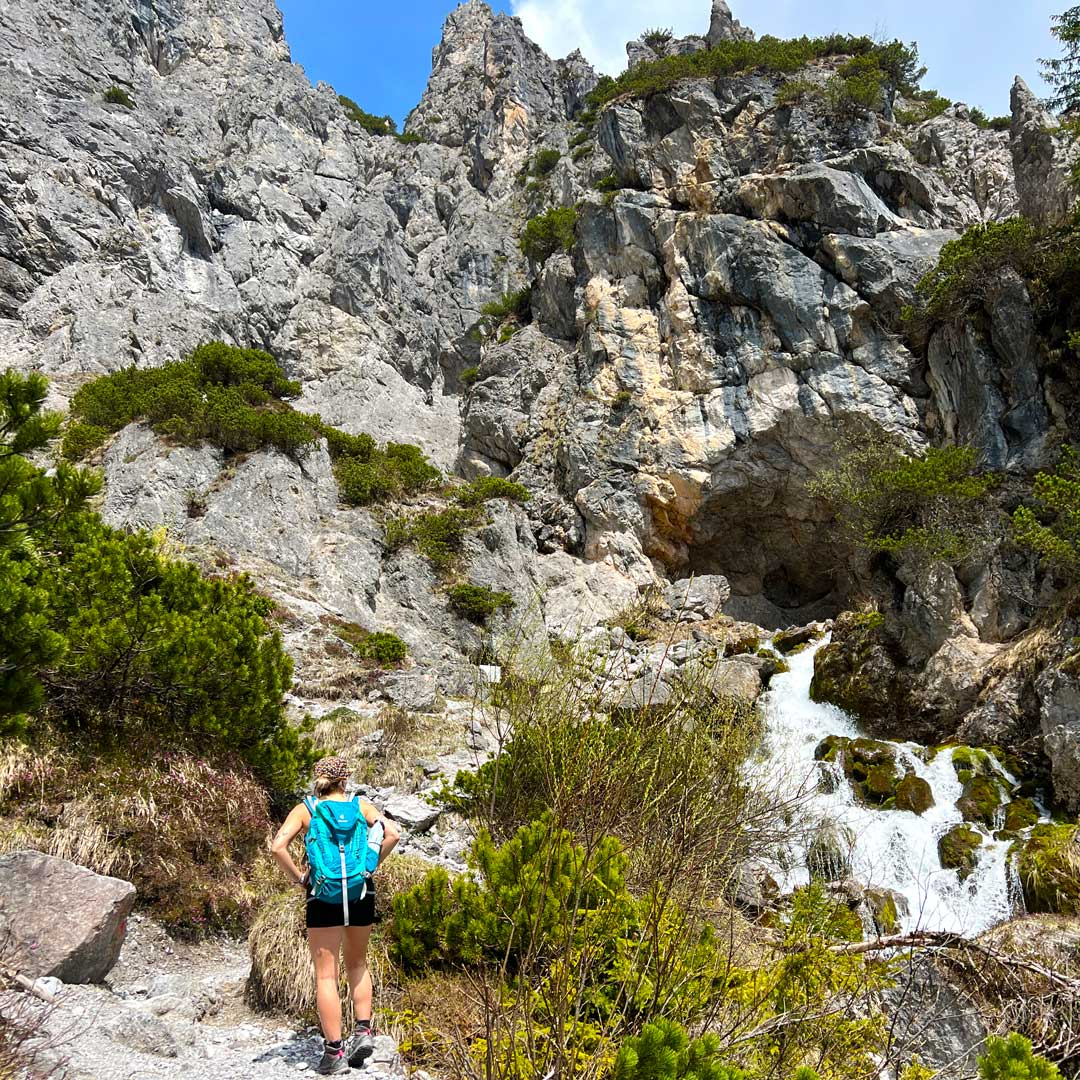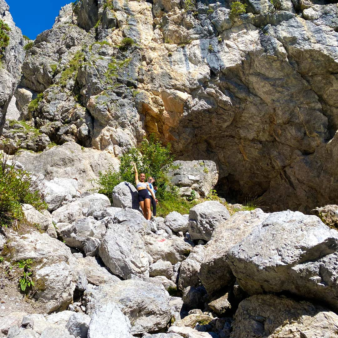As you climb higher, the landscape transforms into a dramatic scene straight out of a fairy tale with the sight of snow accompanying you part of the way. Then the majestic Birnbachloch comes into view, its entrance framed by towering cliffs and rocks. The entrance to the kast-spring is an awe-inspiring sight, with water cascading from its mouth in a sparkling waterfall that creates a mesmerizing mist. For the fearless explorer, venturing into the spring reveals a tiny lake. Take this opportunity and jump into the ice-cold waters. The atmosphere is almost magical, with the sound of dripping water echoing around you.