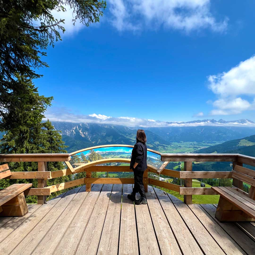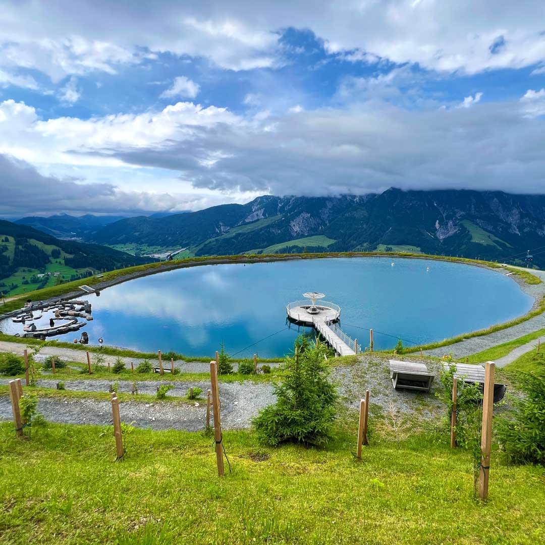 Artful Hike: For our way back down we decided to take the trail of Arts. This inspiring path with art installations winds through tranquil forests and ends at the Senses Park. Here, a shimmering lake offers the perfect spot to rest your tired feet in the Kneipp area. Before we zoomed down in the cable car, we made a pit stop at the Steinadlerbar to sip on some tasty drinks and watch the majestic Leoganger Steinberge turn orange in the upcoming sunset.